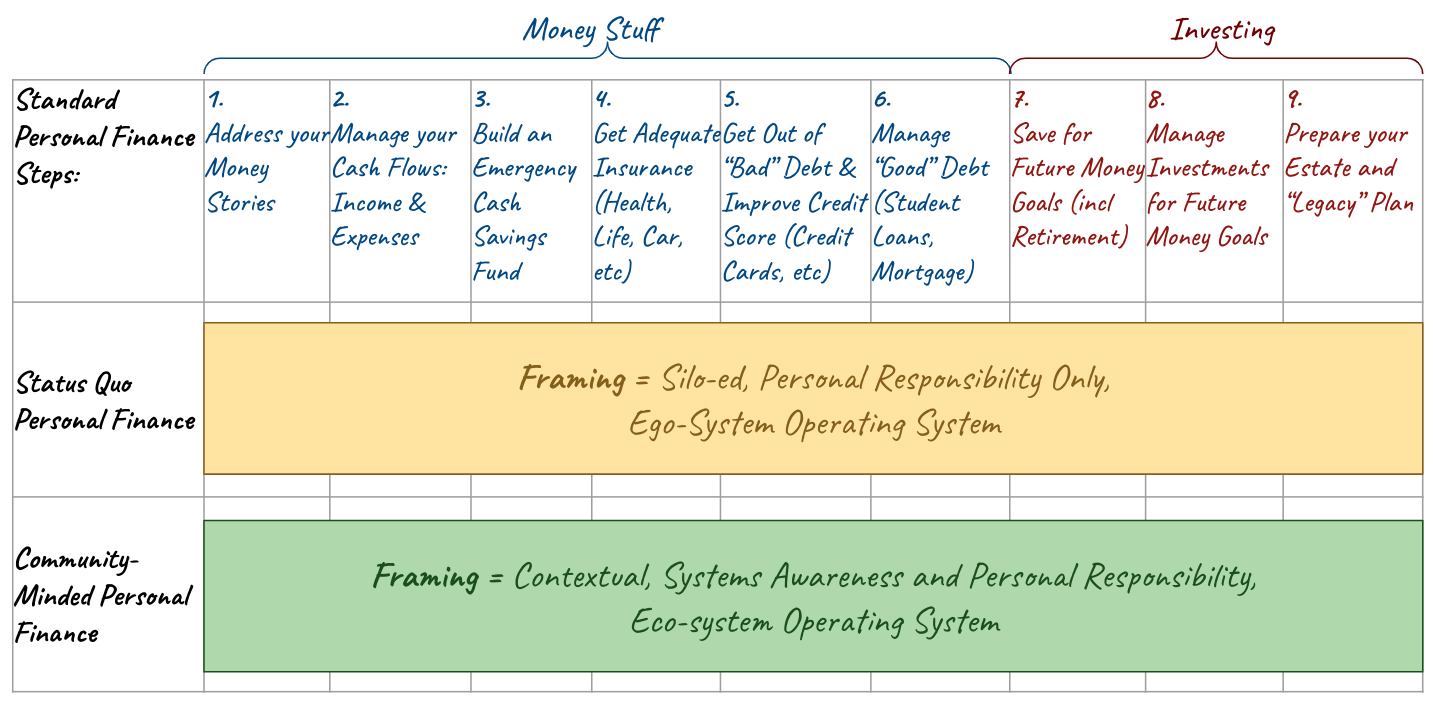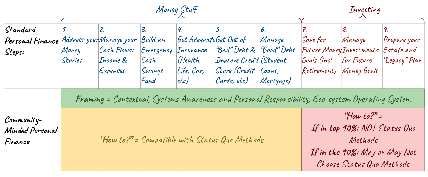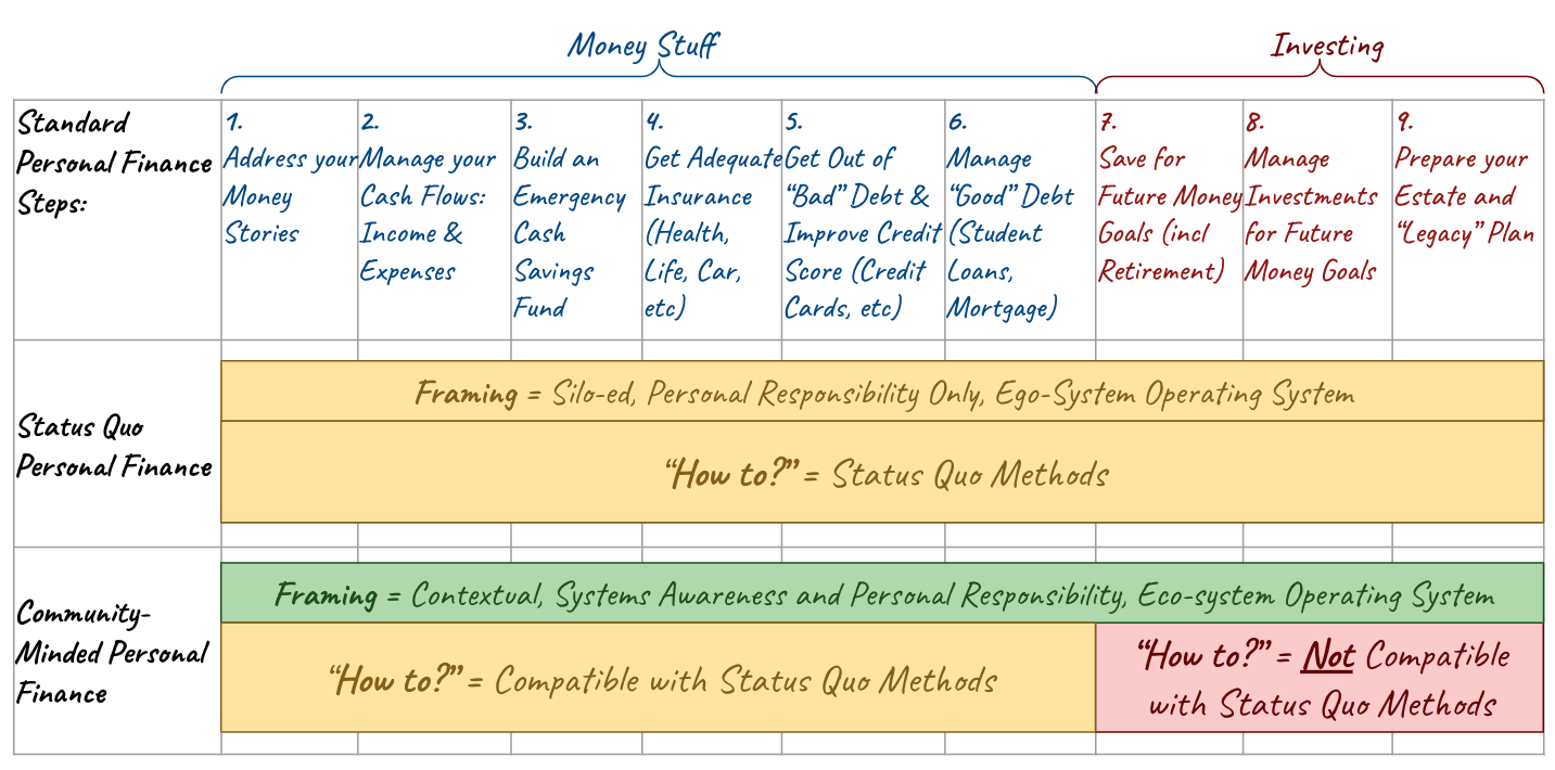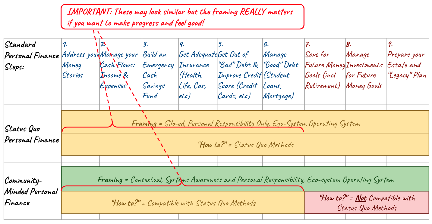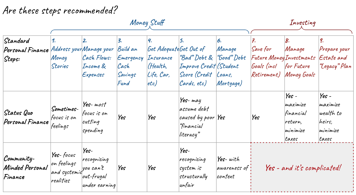 1) That the personal finance steps we need to address are similar whether we are taking a community-minded or status quo approach, but what’s really different is the framing.