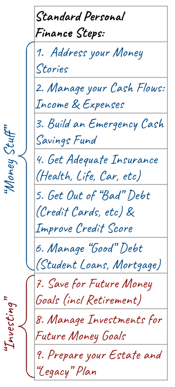 There are some standard personal finance steps that you will find - in one version or another - in almost all personal finance “how to” resources. These steps look something like this: